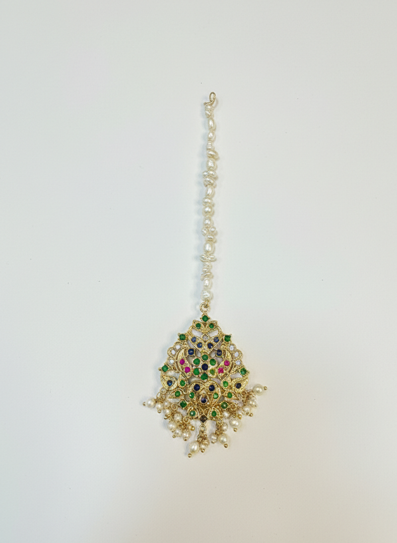 Designed to sit gracefully on the forehead, it serves as a mesmerizing focal point for weddings, festive celebrations, and formal gatherings.