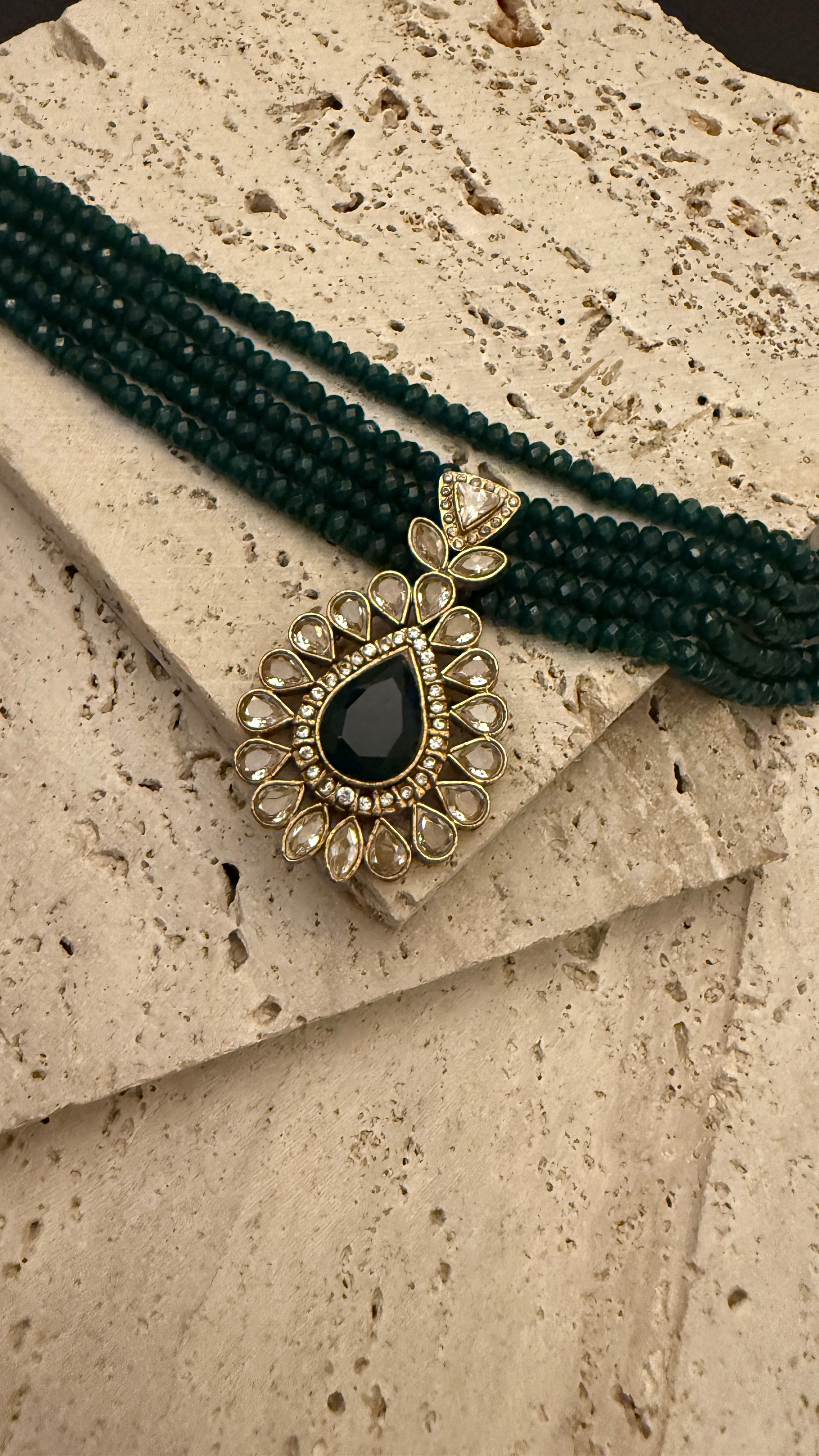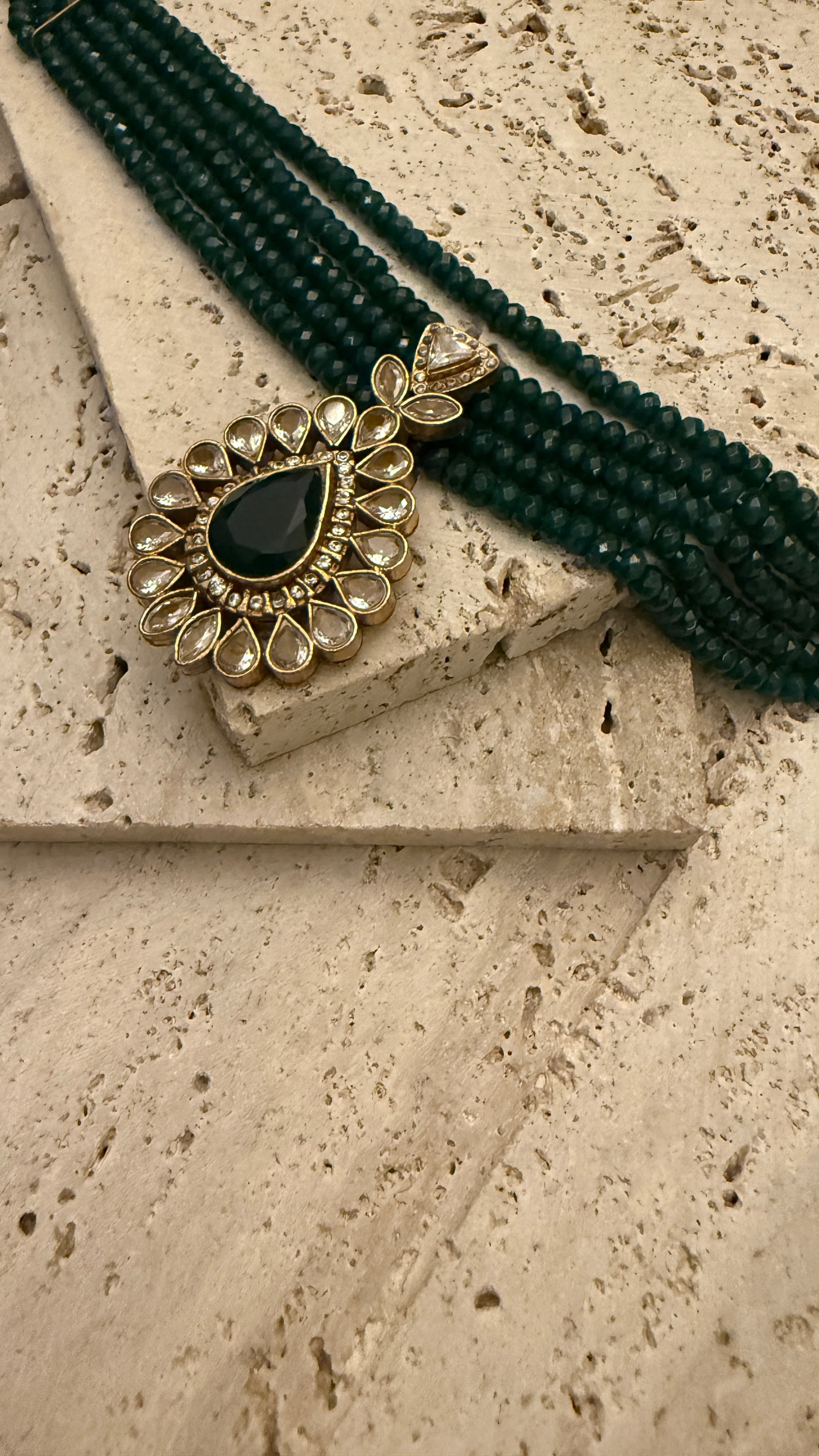 The Amber chokar is the epitome of luxurious elegance, designed to make a sophisticated statement. Adorned with beautiful semi-precious emerald stones, this exclusive, handmade piece instantly upgrades any attire, making it perfect for weddings, parties, or any grand occasion. 💖