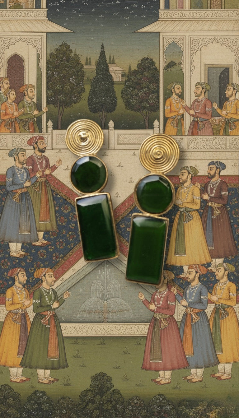Suspended below are two meticulously cut stones in a deep, translucent emerald hue. A round brilliant-cut stone adds a touch of classic radiance, while the elongated rectangular pillar provides a bold, contemporary finish. The rich contrast between the warm gold tones and the forest-green stones makes these a versatile statement piece for both day and night.