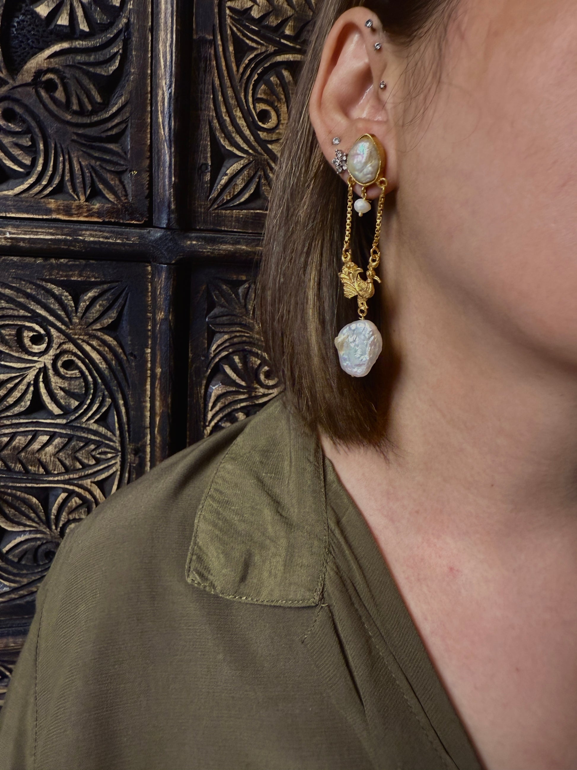To keep your Baroque Bird earrings in pristine condition, avoid direct contact with perfumes and hairsprays. Store them in a soft pouch to protect the natural luster of the pearls. These earrings are a timeless investment in your personal style. π