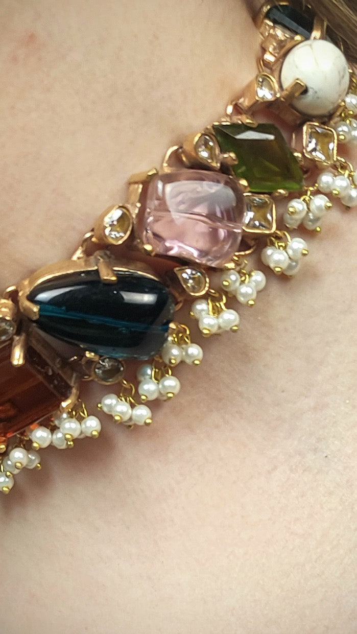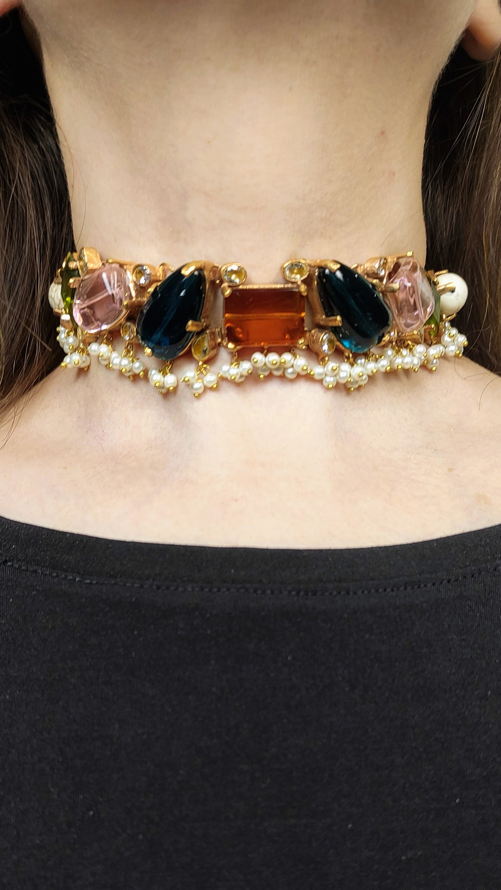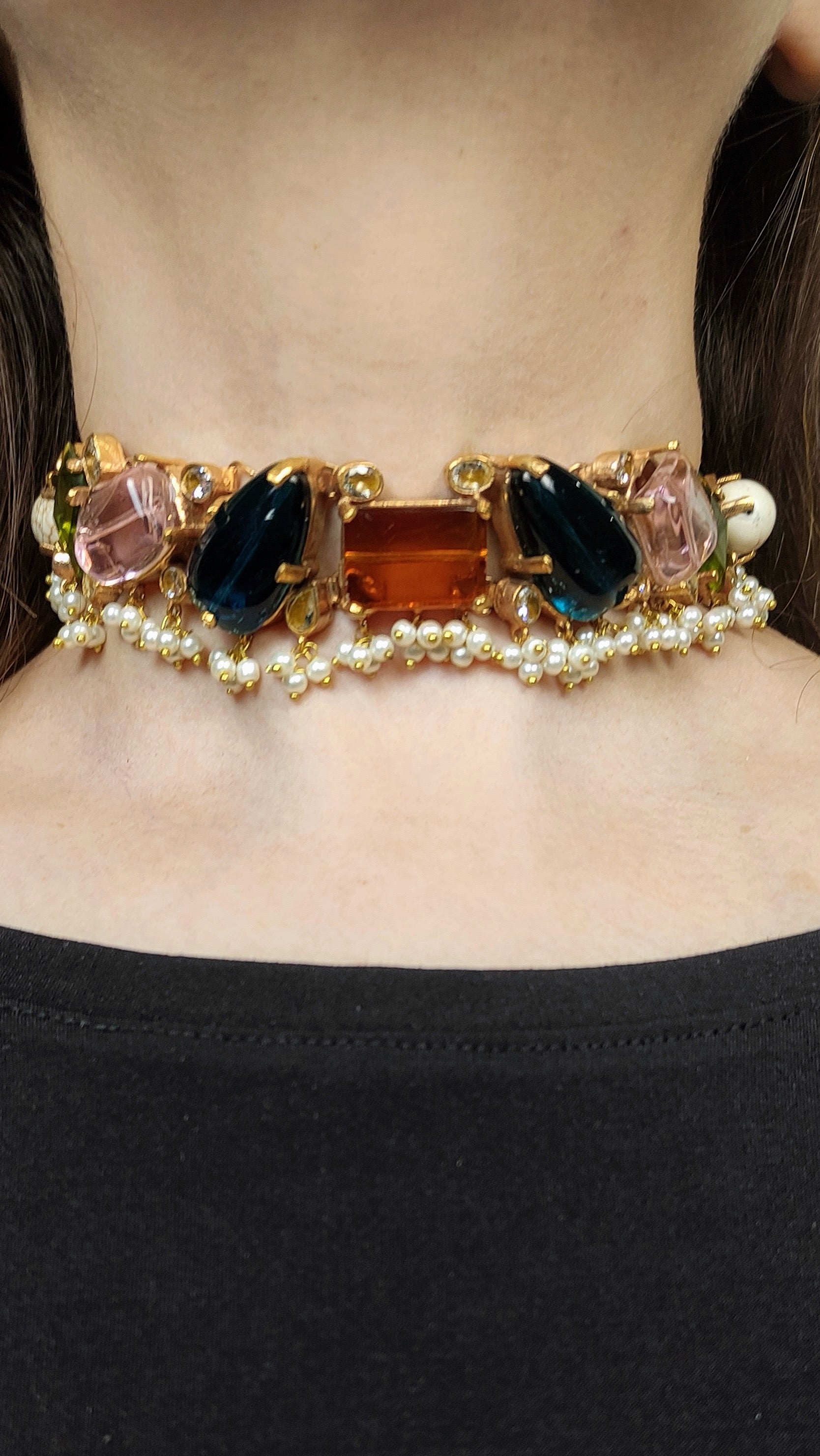 Elevate your evening attire with a piece that captures the essence of a moonlit garden. This stunning statement choker features a hand-selected arrangement of multifaceted gemstones in deep teal, soft rose, and warm amber. Framed by a delicate fringe of cream-colored seed pearls, this piece offers a vintage-inspired silhouette with a modern, eclectic soul. Whether paired with a simple black dress or a silk blouse, it is designed to be the centerpiece of your look.