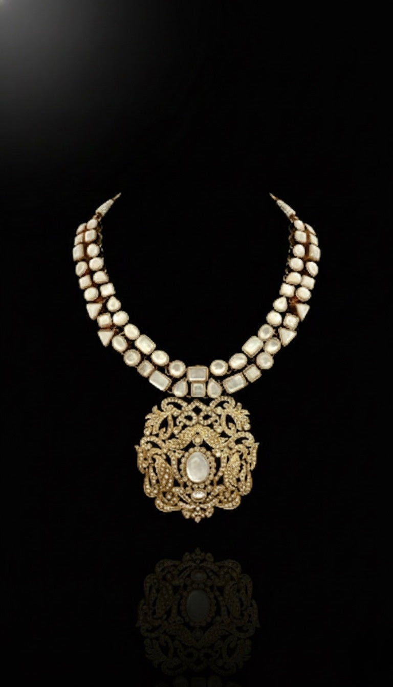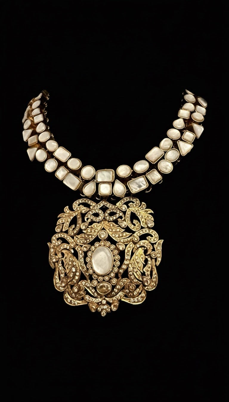 Experience the ultimate in luxury and elegance with our Noor Mahal necklace. Handcrafted with exquisite attention to detail, it features a stunning combination of gold plating and high quality natural stones. Make a statement of sophistication and grace with this exclusive piece.
