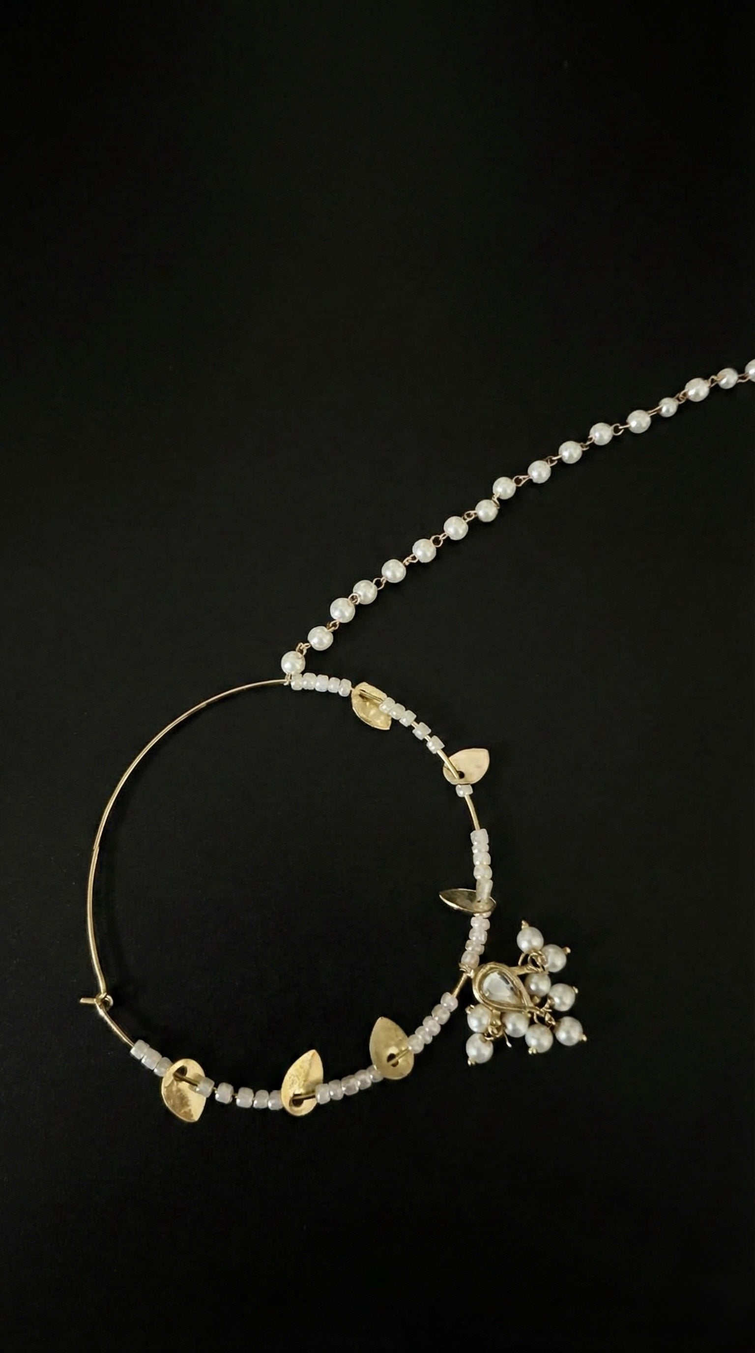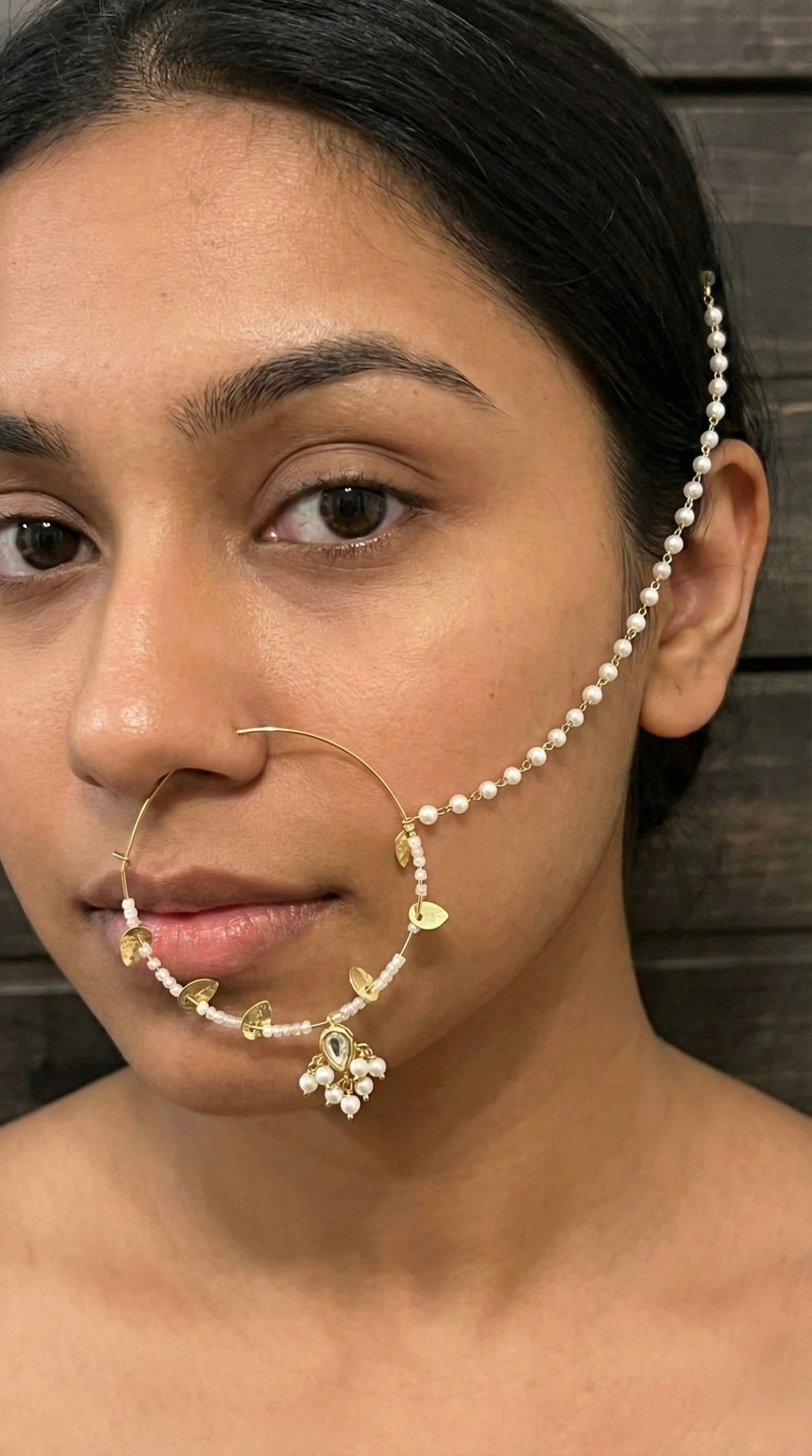 Expertly handcrafted with gold plating, Noori's beautiful nath is the perfect accessory for any bride. Add a touch of elegance and tradition to your special day. Elevate your look with this stunning and intricate piece.